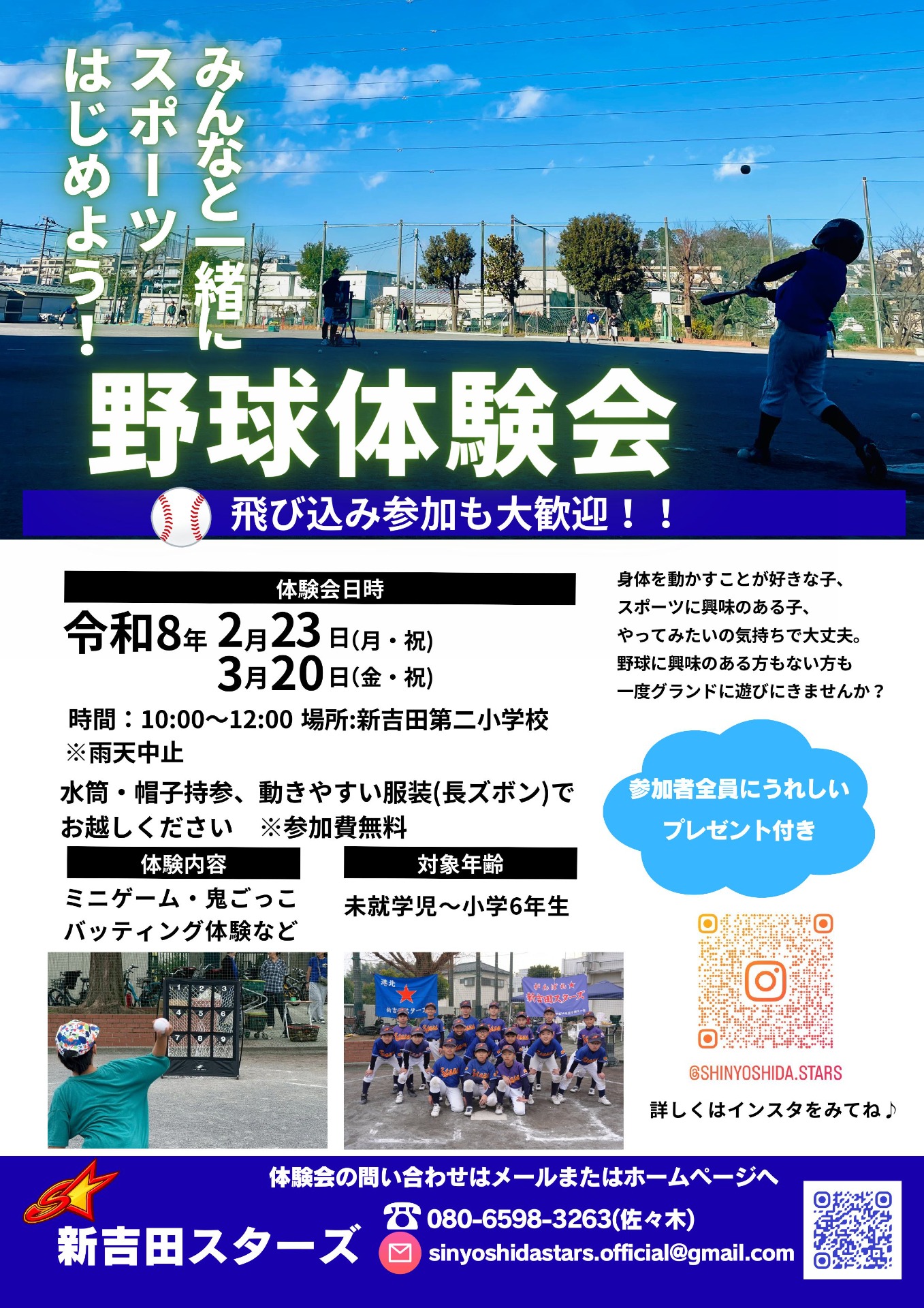 2月23日&3月20日両日の10~12時で開催します!詳細はHP・インスタに順次upします。新生活を迎える春、野球に興味がある子もそうでない子も、お気軽にお越しください!